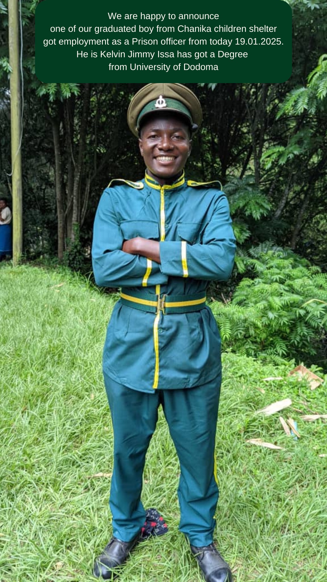 On January 18, 2025, a passing-out ceremony for new prison officers was held at the Mbeya Regional Training Centre. We are pleased to announce that Kelvin Jimmy Issa, a graduate from the Chanika Children’s Shelter, has secured a position as a prison officer starting January 19, 2025. Kelvin holds a degree from the University of Dodoma and previously worked as an administrative officer at the shelter.